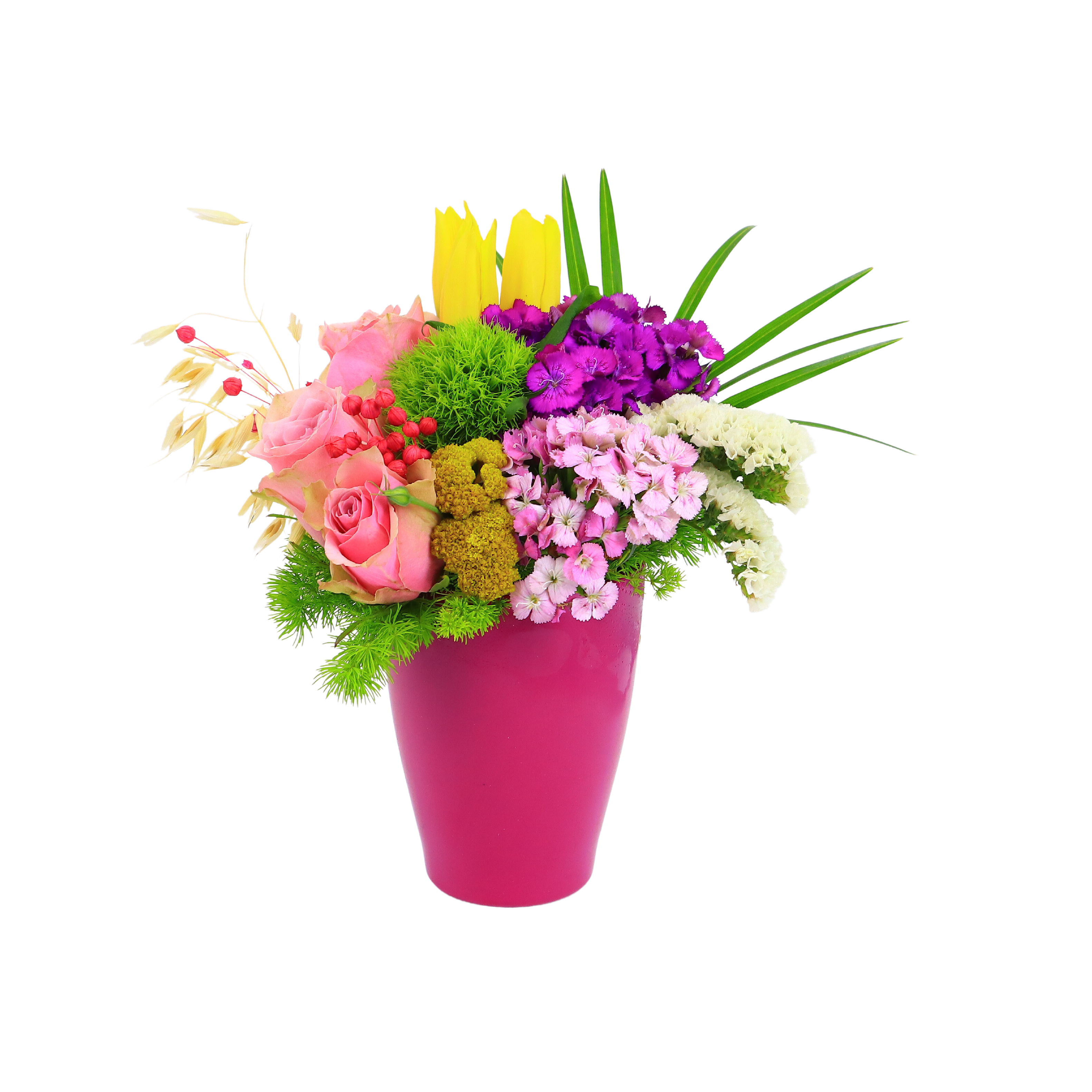 Pembe seramik vazo içerisinde sünger (oasis) bulunmaktadır. Islak sünger içine saplı olduğundan sünger’in ıslaklık derecesi kontrol edilmelidir. Doğrudan güneş ışığı almaması çiçek ömrünü uzatır. Oda sıcaklığında ofisler, evler, işyerleri için çok uygundur.