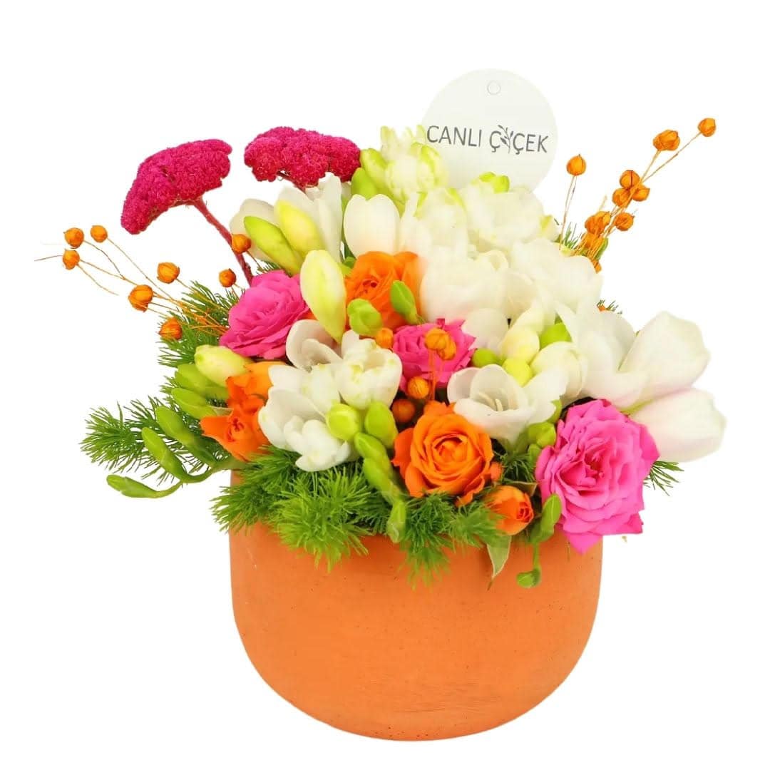 Turuncu seramik vazo içerisinde sünger (oasis) bulunmaktadır. Islak sünger içine saplı olduğundan sünger’in ıslaklık derecesi kontrol edilmelidir. Doğrudan güneş ışığı almaması çiçek ömrünü uzatır. Oda sıcaklığında ofisler, evler, işyerleri için çok uygundur.