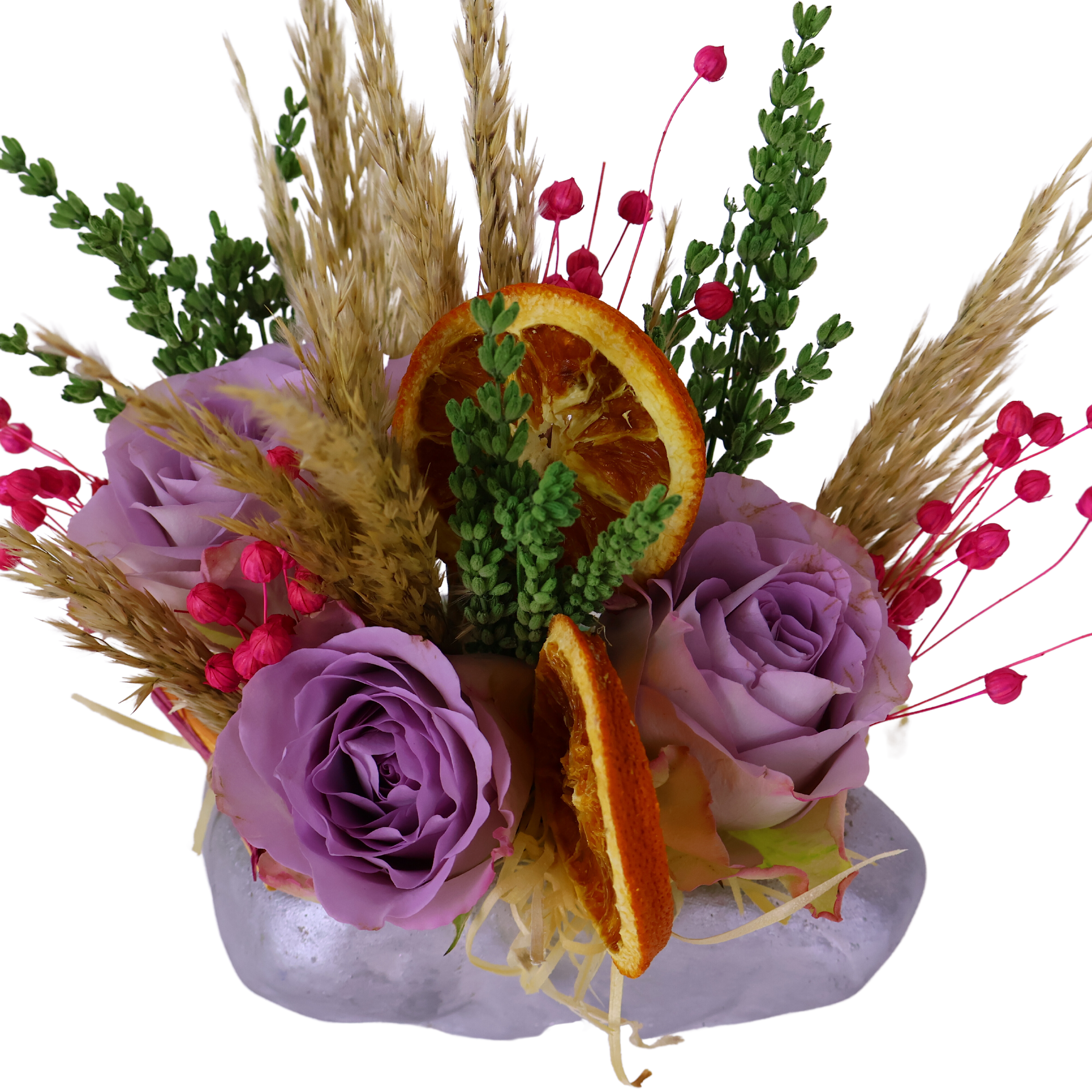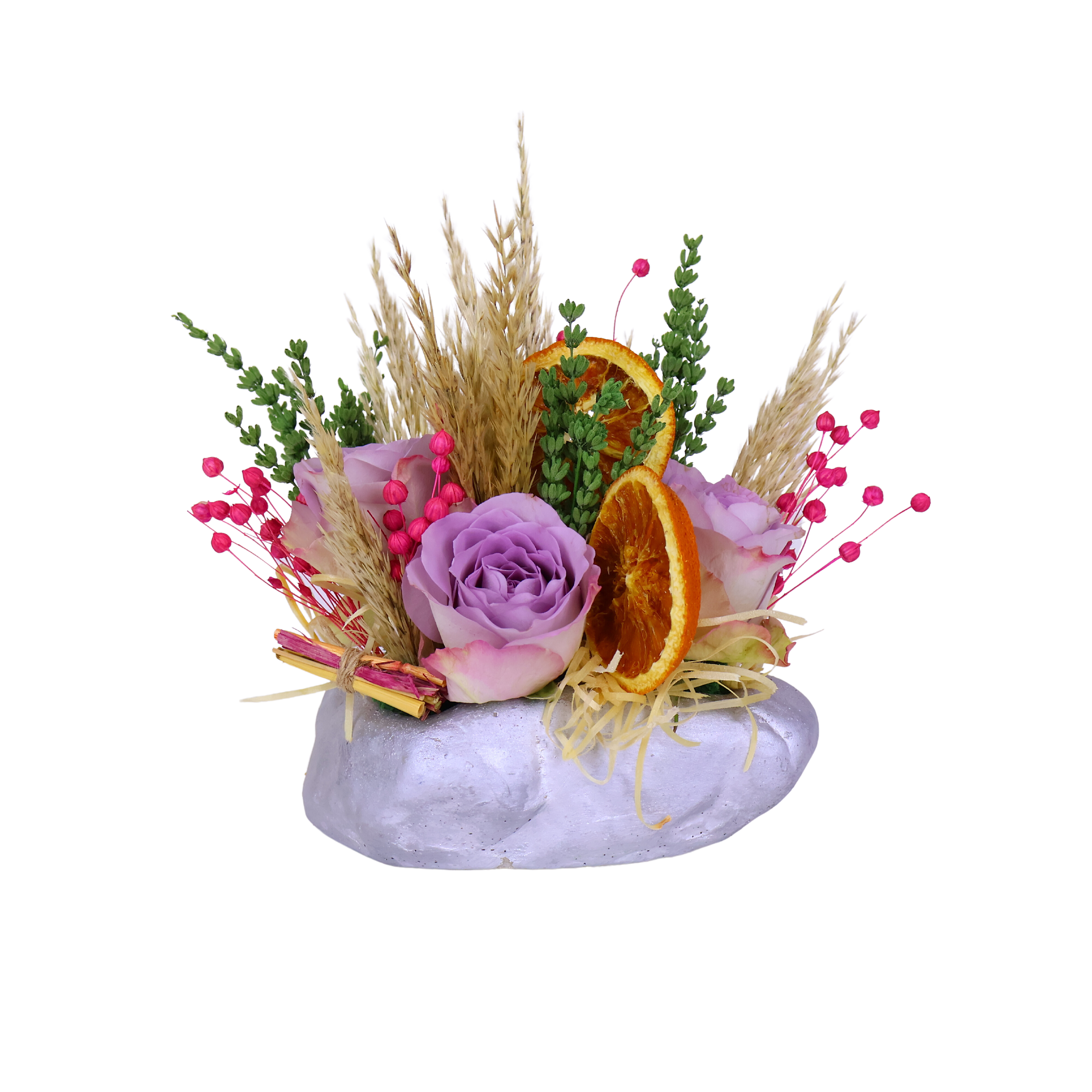 Gri seramik vazo içerisinde sünger (oasis) bulunmaktadır. Islak sünger içine saplı olduğundan sünger’in ıslaklık derecesi kontrol edilmelidir. Doğrudan güneş ışığı almaması çiçek ömrünü uzatır. Oda sıcaklığında ofisler, evler, işyerleri için çok uygundur.
